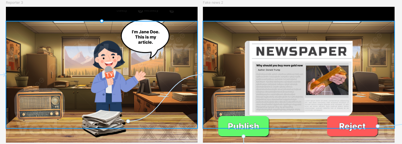 From this, I started to build a brief prototype with an oversimplified version of the main gameplay, where the player can just highlight over certain items to help determine if they were real or fake articles. So, as a temporary representation of the investigation, I made all the pieces of the article interactable. Where the player would just mouse over a certain part of the article to detect if it was real or not.